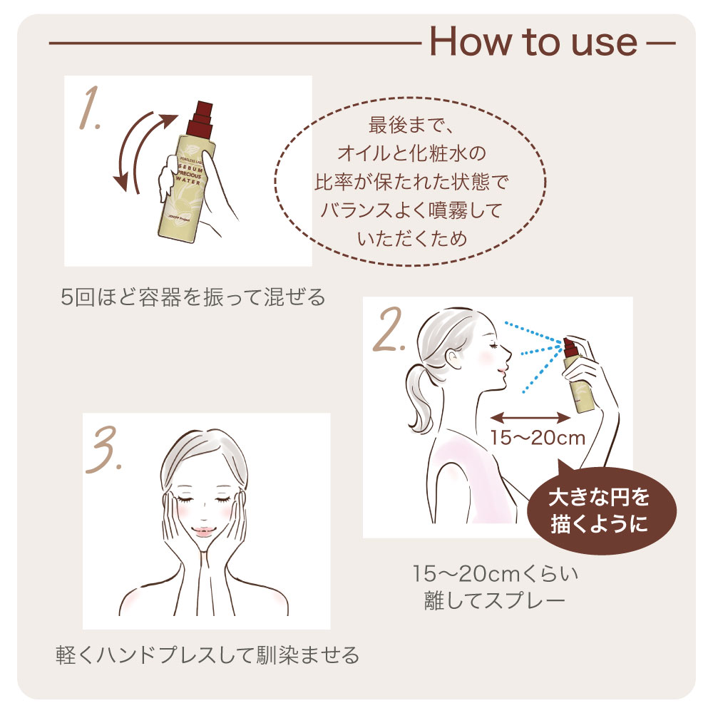 2層式のためご使用前に5回ほど容器を振って混ぜてください。(最後まで、オイルと化粧水の比率が保たれた状態でバランスよく噴霧していただくため) ミストを顔から15~20cmくらい離して大きな円を描くようにして顔全体にかかるようにスプレーします。最後に軽くハンドプレスして馴染ませます。